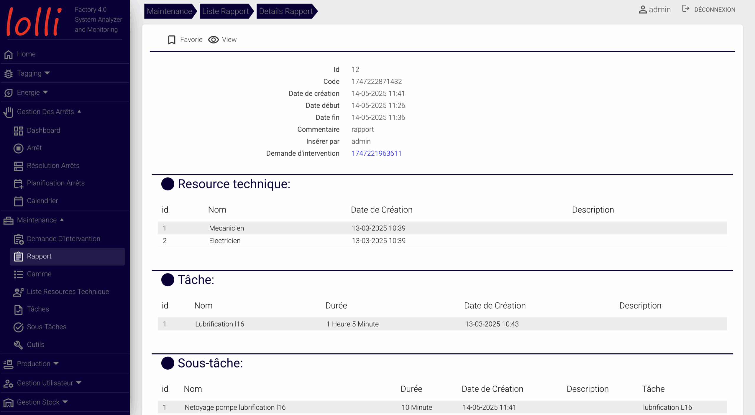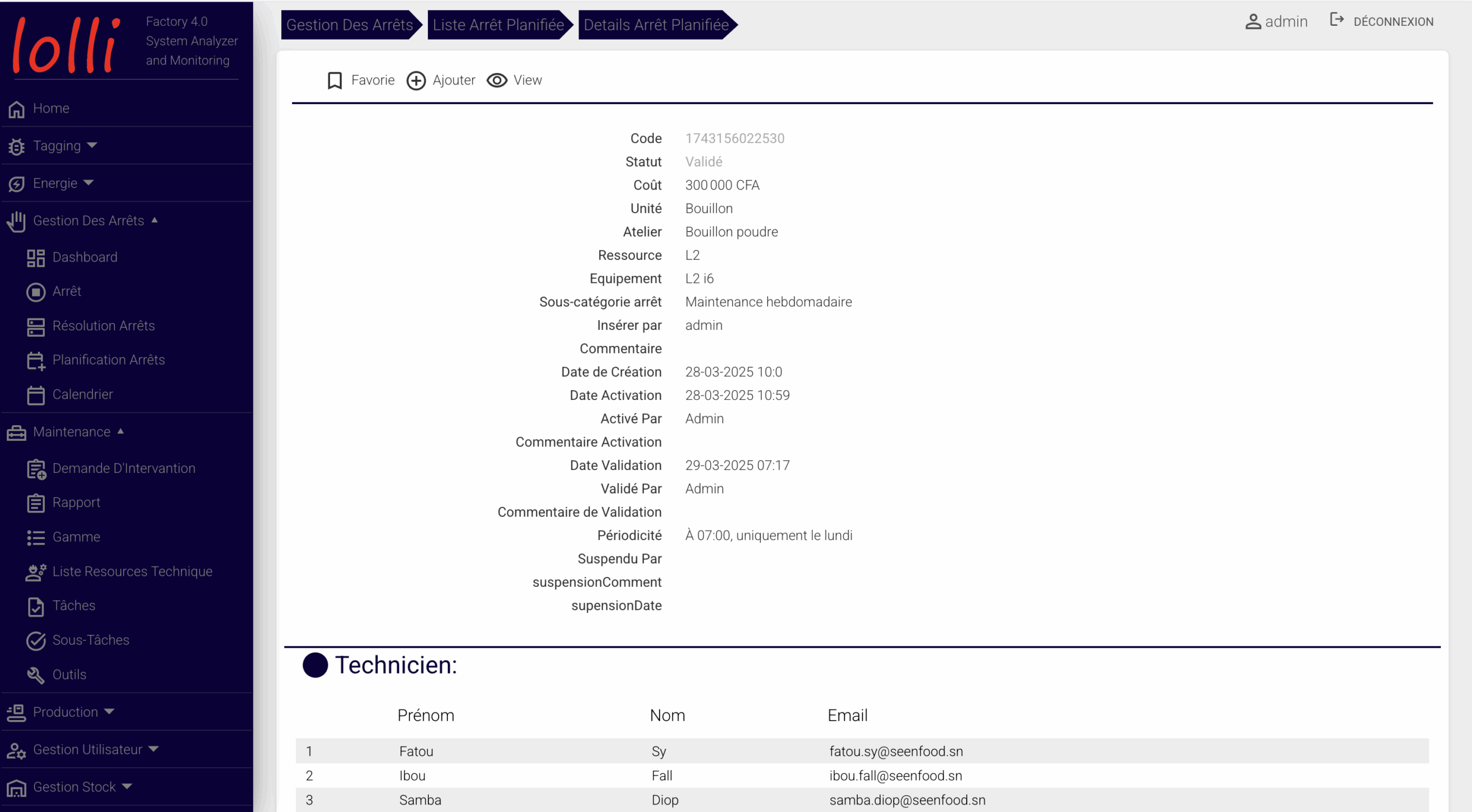 Les arrêts machines sont récupérés automatique à partir du système. Les arrêts techniques sont liées à une demande d’intervention digitalisé. Un rapport technique peut être fait à la suite de l’intervention.